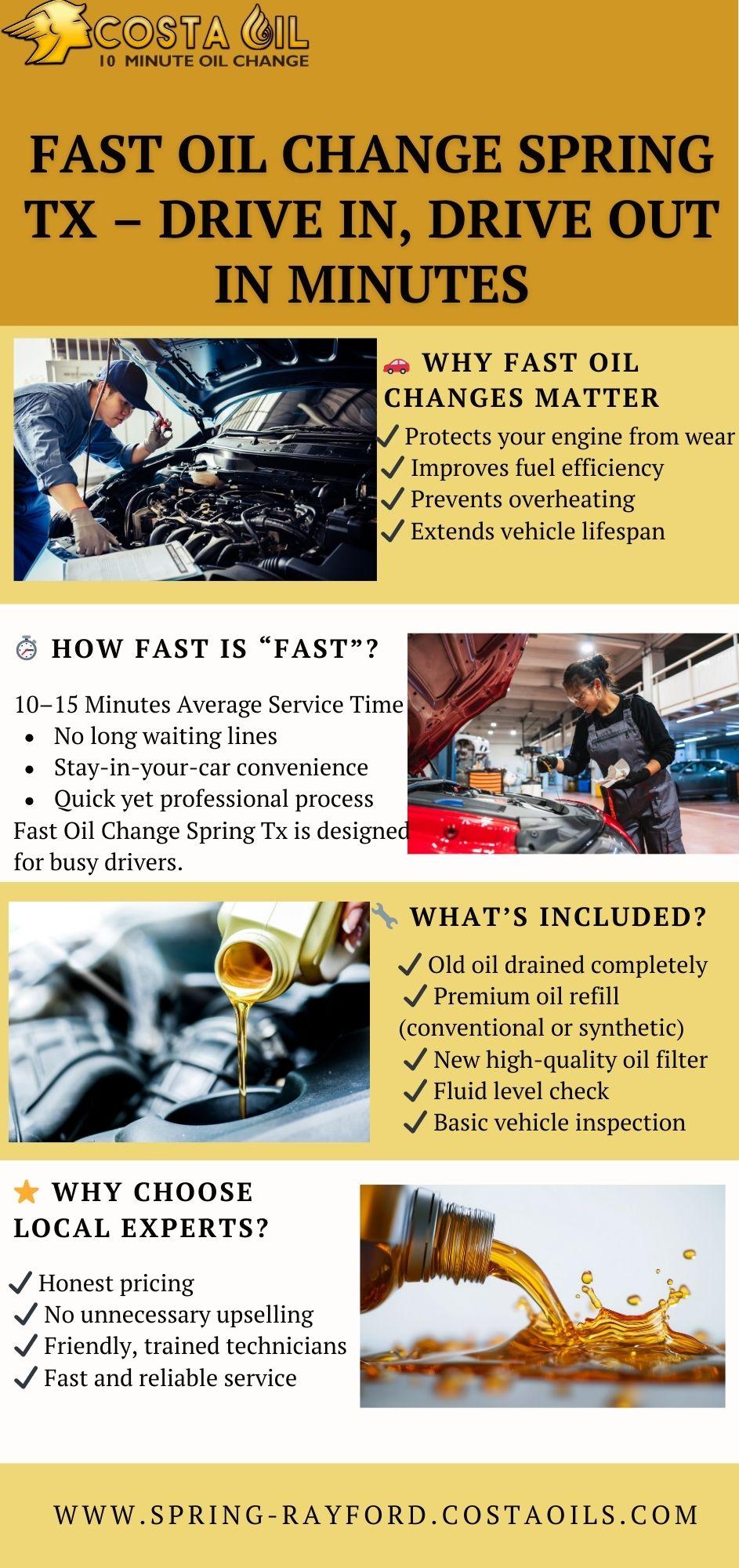Costa Oil Spring is a top-rated, family-owned quick lube center in Spring, TX, specializing in 10-minute stay-in-your-car oil changes. They offer certified service with no upselling, free fluid top-offs, and exclusive discounts. Trusted for speed, transparency, value, and deliver a hassle-free experience every time.